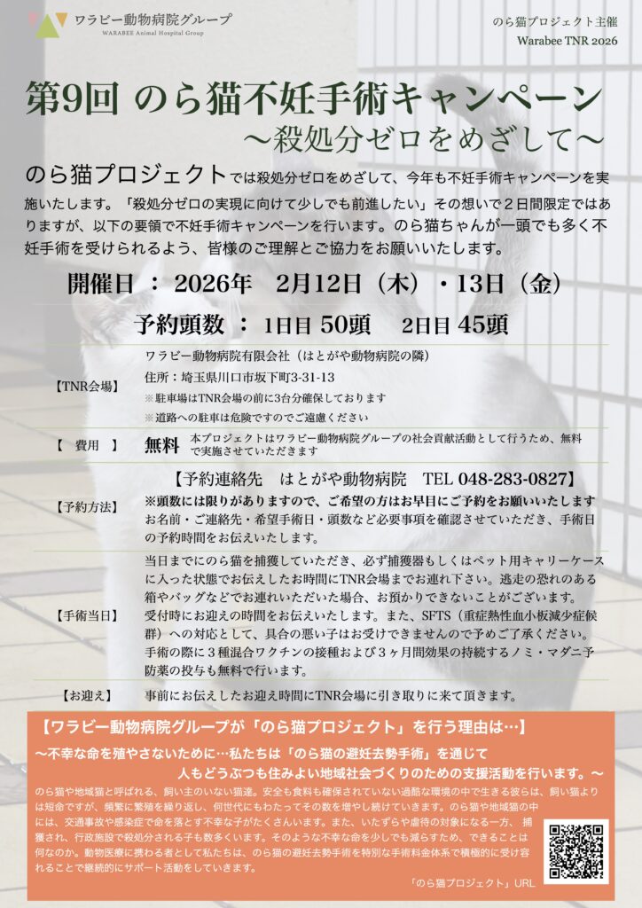 殺処分ゼロを目指す「のら猫プロジェクト」の一環として、不妊手術キャンペーン(TNR)を実施します(手術費用無料)。一頭でも多くののら猫のために、ご理解とご協力をお願いいたします。